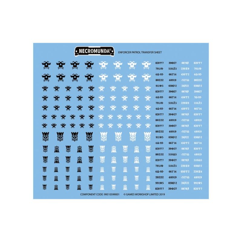 Ce kit est composé de 158 éléments en plastique, de 2x Socles Ronds Necromunda de 25mm, de 6x Socles Ronds Necromunda de 32mm et de 1x Planche de Décalcos de Patrouille de Prévôts proposant 220 décalcos de grande qualité pour décorer vos figurines.