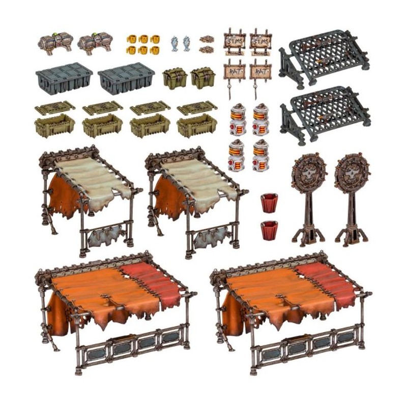 Ce kit se compose de 45 pièces plastique, avec lesquelles vous pouvez assembler les éléments de terrain Underhive Market suivants: