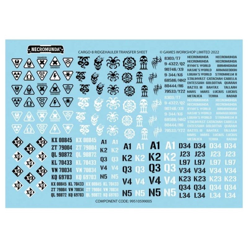 Ce set se compose de 203 pièces plastique, et est fourni avec une Feuille de Décalcos Cargo-8 Ridgehauler comprenant divers signes de véhicule et logos de gang. Cette figurine est fournie non peinte et nécessite assemblage. Notez que certaines pièces sont conçues pour être assemblées sans colle.