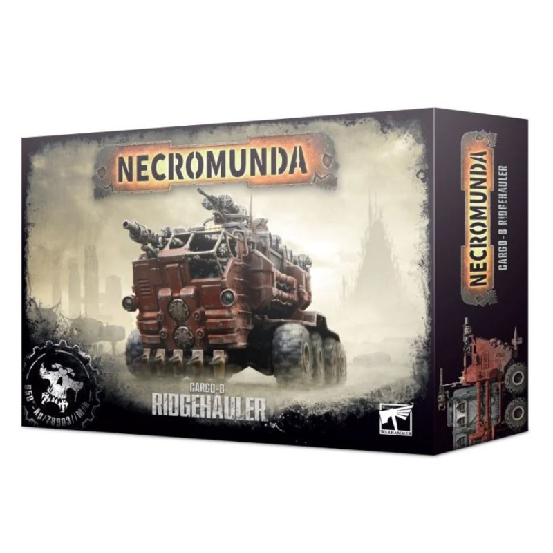 Ce kit plastique vous permet d'assembler un Cargo-8 Ridgehauler, à utiliser avec n'importe quel gang sauf les Ash Waste Nomads. Vous pouvez lui donner 6 ou 8 roues, et un lance-grenades ou une mitrailleuse monté sur la cabine. Les options d'assemblage modulaire du Ridgehauler vous permettent de l'aligner avec un plateau à cargaison pouvant transporter des gangers et des marchandises, ou avec un Conteneur Blindé du Munitorum. Le Conteneur peut avoir jusqu'à deux mitrailleuses ou bolters Storm, et être assemblé avec deux mitrailleurs ou écoutilles fermées. Le Cargo-8 Ridgehauler peut aussi être aligné avec un amarrage arrière ajustable, ce qui lui permet de tracter un Ridgehauler Trailer pour former un train routier.