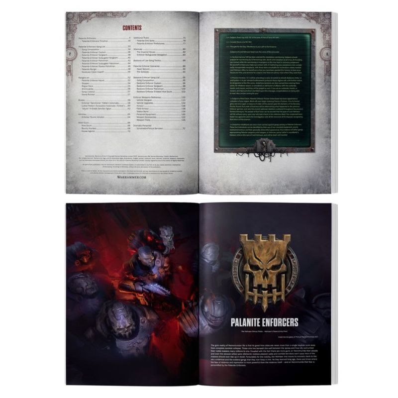 – Le contexte des Palanite Enforcers : des informations détaillées sur ces hommes de loi impitoyables qui patrouillent Necromunda en toute impunité, y compris leur organisation et leur hiérarchie.
