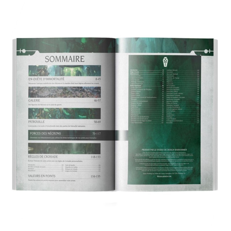 – 47 fiches techniques détaillant les profils, l'équipement et les aptitudes uniques de toutes les unités des Nécrons, des Guerriers Nécrons sans âme à Imotekh, le Seigneur des Tempêtes