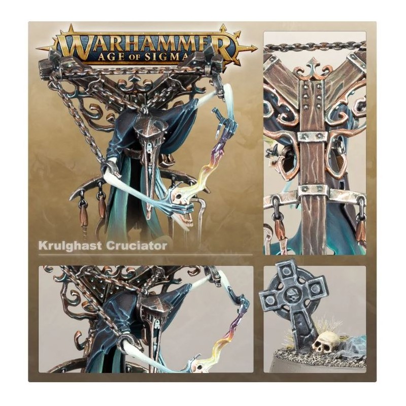 Répandez la terreur sur le champ de bataille avec des instruments de torture et des couteaux à écorcher idéaux pour pénétrer l'armure des ennemis de Nagash. Le mieux (ou le pire), c'est leur pouvoir spectral se déchaîne pleinement une fois que vos adversaires ont senti la morsure de leurs aptitudes fantasmagoriques. La souffrance de l'ennemi fait du Krulghast Cruciator un fanal de magie de la mort qui ancre les Nighthaunts au monde matériel.