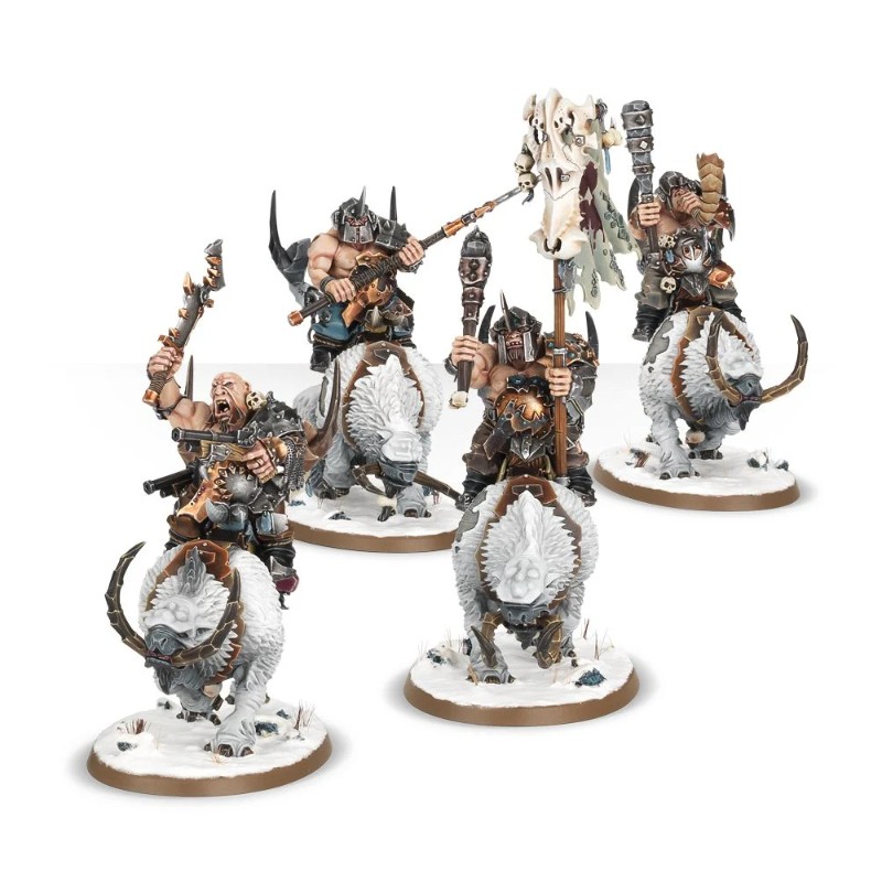 Ce kit plastique contient tous les composants nécessaires pour assembler une Mournfang Pack, composée de 4 Ogors à dos de Mournfangs. Fourni avec 4 socles ovales Citadel de 90x52mm.