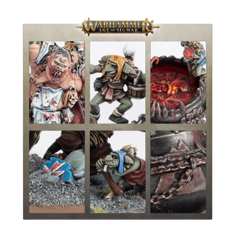 Description du produitLes Slaughtermasters se sont entièrement abandonnés à leurs pulsions, en allant jusqu'à se trancher les membres pour les remplacer par des lames et crochets rouillés. Ils traînent un chaudron en pleine bataille afin de pouvoir concocter un brouet sitôt qu'ils ont débité leurs victimes