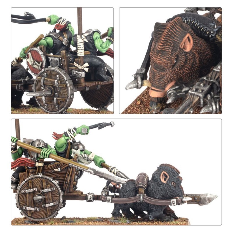 Ce kit en plastique permet d'assembler 2 Chars à Sangliers Orques, utilisables par les Tribus d'Orques é Gobelins dans les parties de Warhammer: The Old World. Les équipages d'Orques peuvent être équipés d'armes de base et de lances de cavalerie, et les chars proposent différentes options d'assemblage esthétiques, dont une icône de chef à l'air féroce.