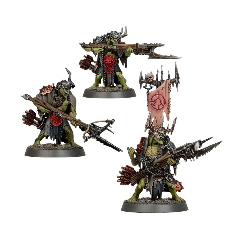 Ce kit en 41 pièces permet d'assembler trois Embrocheurs, avec un éventail d'options de têtes et d'arbalètes compatibles avec les trois corps. Il y a également l'option d'en assembler un en tant que Boss Embrocheur, avec hampe de bannière, deux casques au choix, plus une arbalète distincte. Ces figurines sont fournies non peintes et nécessitent assemblage. Elles sont fournies avec 3x socles ronds Citadel de 32mm.