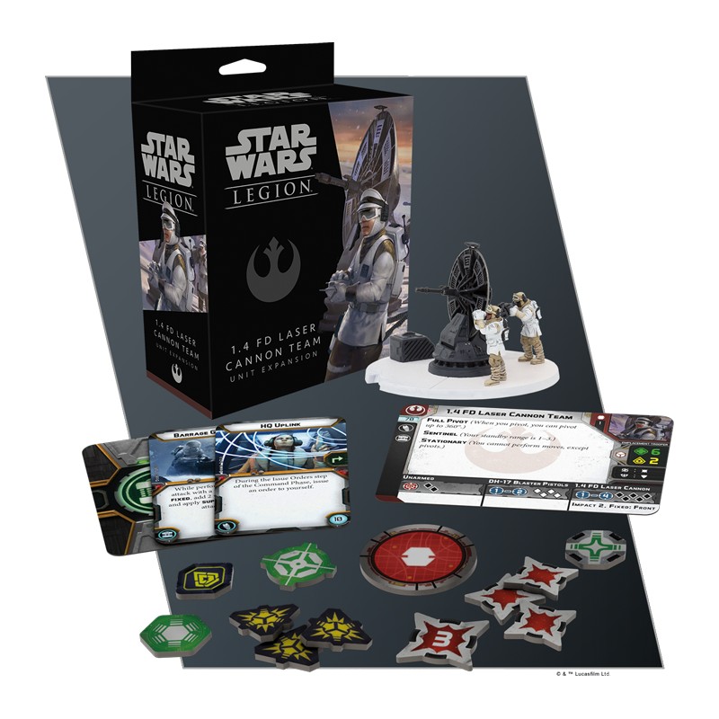 Dans l'extension d'unité 1.4 FD Laser Cannon Team, vous trouverez une figurine 1.4 FD Laser Cannon Team non peinte et facile à assembler qui peut être utilisée comme unité de soutien pour votre armée rebelle. En plus de cette équipe, vous trouverez trois cartes d'amélioration qui vous invitent à modifier davantage votre canon pour en faire une ligne de défense encore plus solide contre les forces de l'Empire.