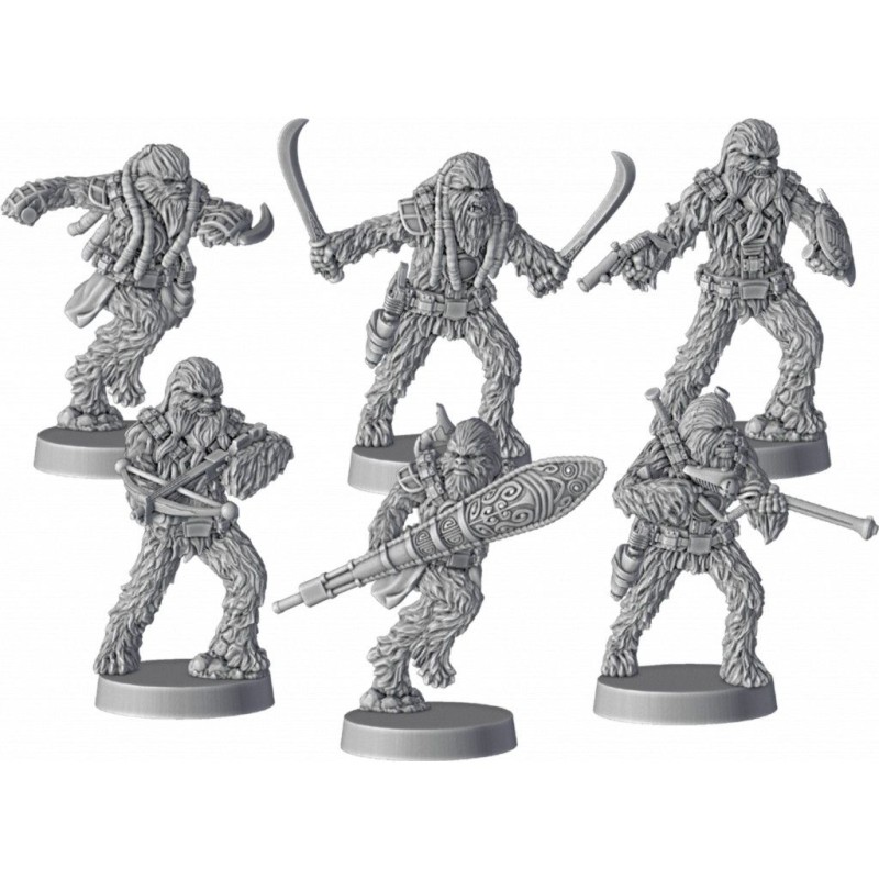 L'extension d'unité met à votre disposition six figurines Wookies qui peuvent être assemblées et utilisées de différentes manières, notamment comme unité à courte portée portant des lames ryyk et des pistolets Kashyyk, ou bien comme unité de tireurs d'élite Wookiee tirant avec des carabines X1.