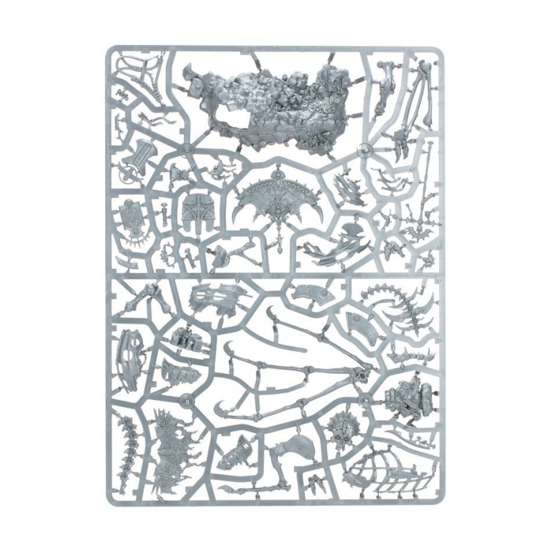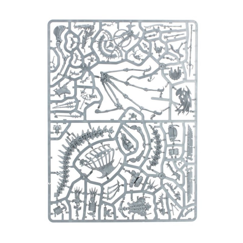 Ce kit plastique permet d'assembler un Roi des Tombes ou un Prêtre Liche monté sur un Dragon d'Os Nécrolithe. Cette pièce centrale terrifiante sera le joyau de toute armée de Rois des Tombes de Khemri, dominant à la fois les champs de bataille et les étagères d'exposition. Le Roi des Tombes se dresse sur une grandiose plate-forme semblable à celle d'un char sur le dos du Dragon d'Os, et il peut être armé d'un khopesh à une main, d'une imposante arme lourde ou d'une lance de cavalerie à trois dents. Le Prêtre Liche est lui assis sur un trône décoré de l'iconographie du Culte Mortuaire, brandissant un bâton rituel pour invoquer un vautour spectral.