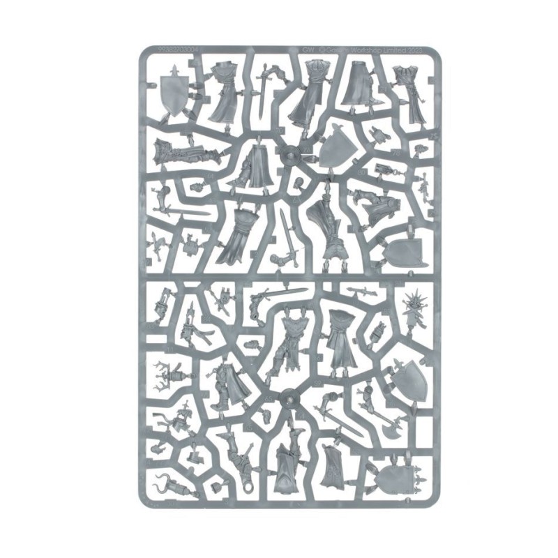 Vous trouverez les éléments nécessaires pour assembler deux améliorations d'état-major, dont des Champions du Royaume (les champions d'unité), des porte-étendard et des musiciens. Cela vous permet de les assembler comme une seule grosse unité de 20 chevaliers ou deux unitès plus petites de 10. Chaque guerrier peut être équipé d'un arme lourde ou d'une arme de base et d'un bouclier, et le kit contient de nombreux choix de têtes, ce qui vous permer de personnaliser vos unités.