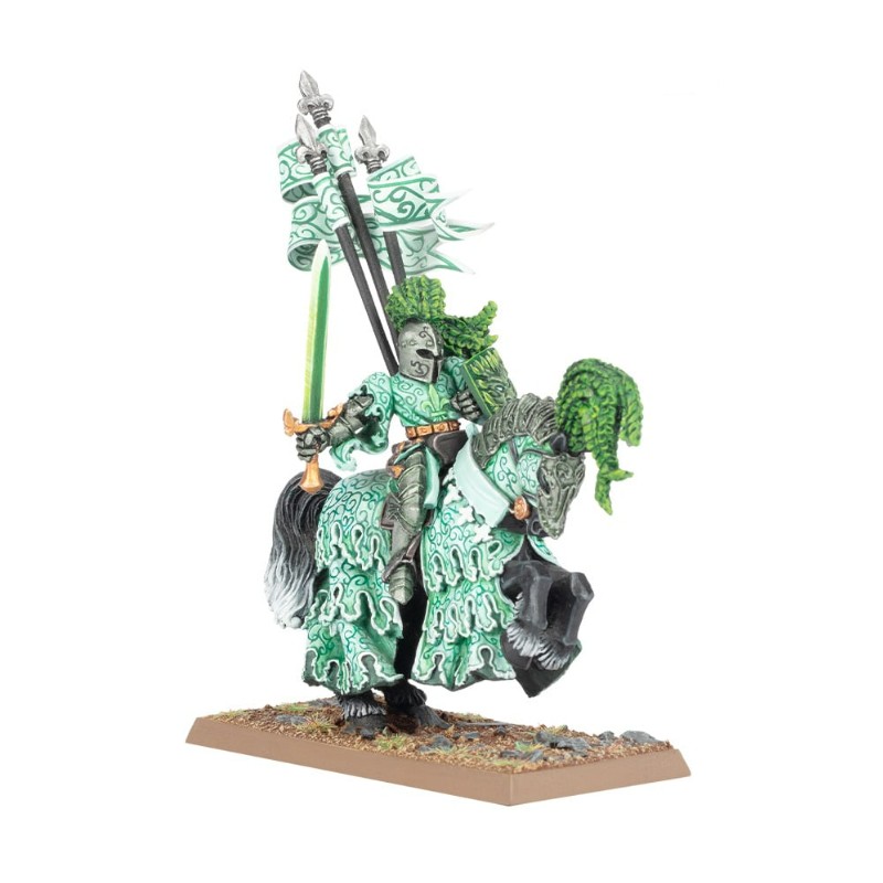 Description du produitLe Chevalier de Sinople est le protecteur sacré du Royaume de Bretonnie, le champion élu de la Dame du Lac, et un personnage populaire du folklore bretonnien. Nombreux sont les récits mentionnant un étrange crépuscule s'abattant sur les terres tandis qu'une brume verte se lève, annonçant l'arrivée d'une silhouette spectrale aux yeux luisants et montée sur un destrier d'ombre.