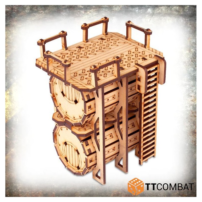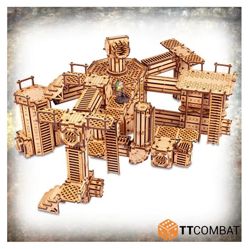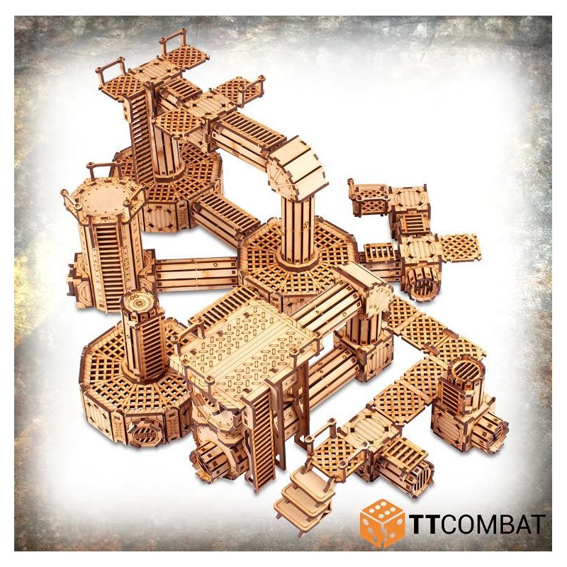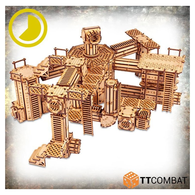 Tous les kits de la Ruche Industrielle sont conçus pour fonctionner ensemble, en utilisant un système de clip innovant pour permettre à chaque pièce de se fixer à une autre. En utilisant la modularité intégrée, vous pouvez attacher des escaliers, des passerelles, des plateformes, des bureaux, des tuyaux, des silos et des murs, le tout dans une masse continue de métal (enfin, de MDF) pour créer littéralement des milliards d'agencements différents. Toute cette modularité rendra vos parties dans la ruche industrielle tentaculaire plus amusantes que jamais.