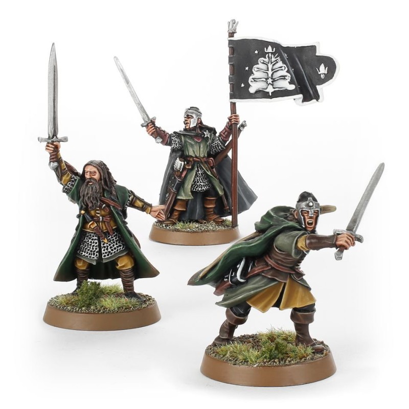 Ce set contient trois figurines métal – Halbarad (une version avec un arc à la main et une autre avec la bannière d'Arwen Étoile du Soir) et Arathorn – fournies avec trois socles ronds Citadel de 25mm.