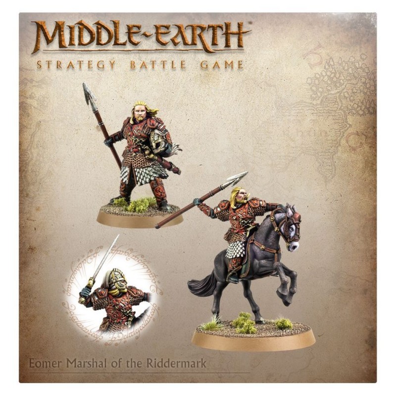 Éomer, Marshal of the Riddermark est un kit plastique composé de 2 figurines, 1 à pied et 1 montée en posture de charge. Les deux figurines proposent les options de tête nue ou casquée, et au choix un javelot ou une épée dans une main, et un bouclier ou un casque dans l'autre. Les deux figurines sont en armure lourde, et on peut assembler le cheval sans armure ou avec une barde d'écailles.