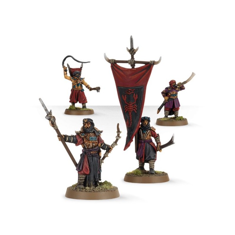 Cette boîte contient des Haradrim Commanders, des figurines en résine comprenant un Haradrim Captain, un sonneur de cor de guerre, un porte-bannière et un Taskmaster, le tout fourni en 6 composants et 4 socles ronds de 25mm.