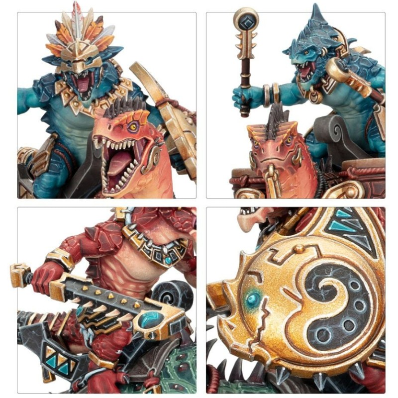 Ce kit plastique permet d'assembler trois Lanciers Aggradons, de formidables cavaliers assoiffés de sang pour les Séraphons. Les chevaucheurs saurus peuvent être équipés d'une massue de célestite barbelée ou d'une lance de célestite acérée, et ils proposent chacun deux colliers protecteurs pour vous donner le choix dans la position. Une figurine peut être assemblée comme champion Alpha, avec un choix de têtes et d'armes uniques, des positions de bras différentes et un bouclier unique. Une autre peut être assemblée comme musicien Tambour de Guerre, et une autre comme Porte-icône.
