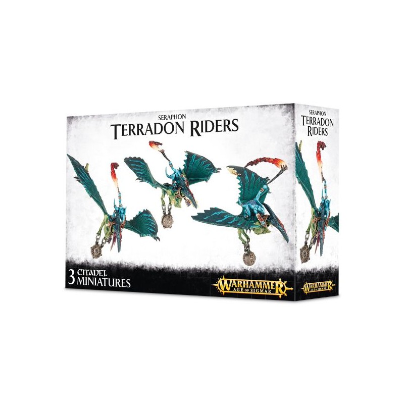 Ce kit plastique contient tous les composants nécessaires pour assembler trois Terradon Riders, de funestes porteurs de mort qui frappent vite et avec précision au service des slanns. Armés au choix de javelines d'impact stellaire ou de bolas à hélio-sangsues, l'un d'eux peut être assemblé en tant que Master of the Skies (armé d'une lame des cieux, et pouvant porter un masque spécial). De nombreuses pièces en plus, comme des plumes et des rocs, peuvent agrémenter les socles. Fournis avec trois socles ronds Citadel de 50mm et trois tiges de socles volants.