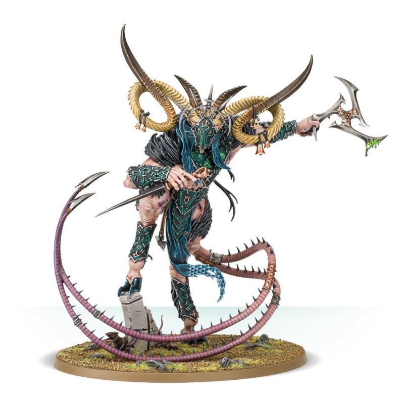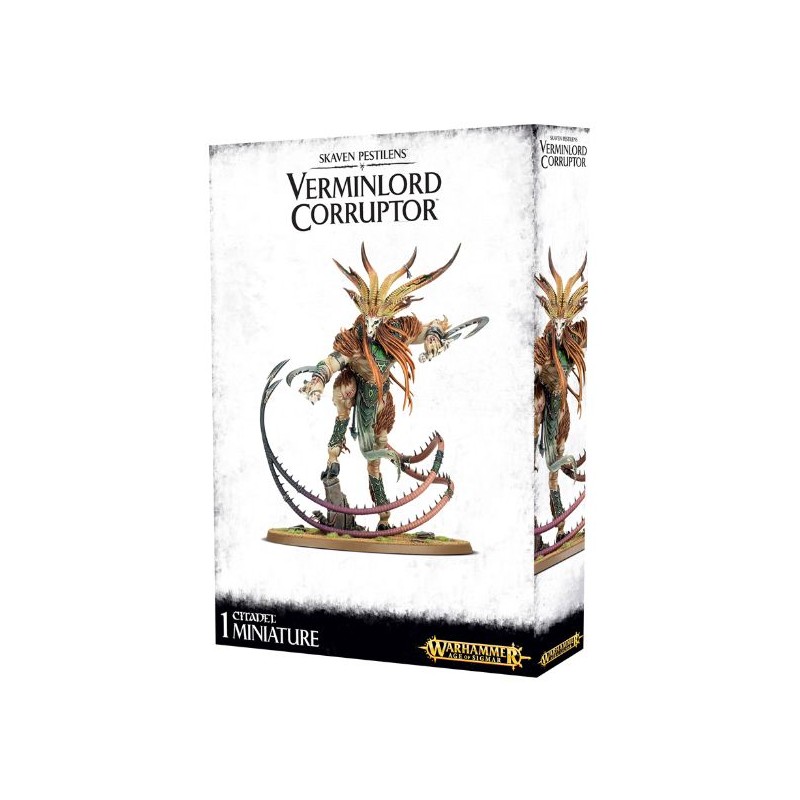 Le Verminlord Corruptor manie deux faucilles de la peste. Sa tête se réduit à un crâne, encadré de cornes cassées et de longues mèches de cheveux.