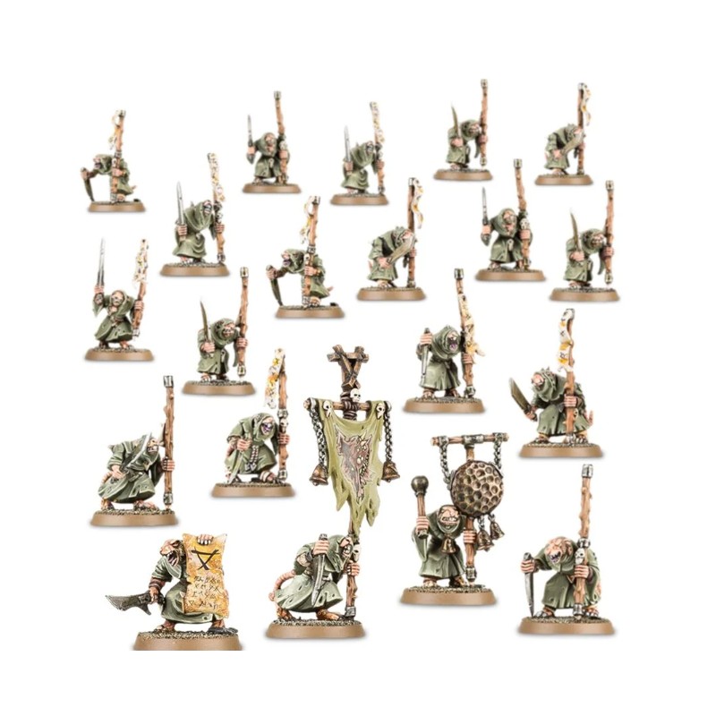 Ce kit plastique vous fournit tout le nécessaire pour monter une horde couinante de vingt Plague Monks, avec l'option de les armer d'une paire de lames fétides ou d'une lame fétide et d'un bâton des plaies.