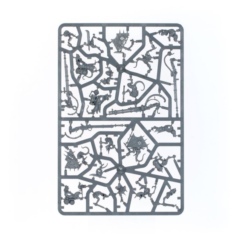 Ce kit en plastique permet d'assembler trois équipes de Jezzails à Malepierre, des unités de tir habiles pour votre armée de Skavens. Ces assassins à longue portée aiment abattre l'ennemi depuis une distance prudente, et leurs boucliers les rendent étonnamment résistants. Tous les porteurs de boucliers s'adaptent à n'importe lequel des artilleurs du kit, et vous trouverez les options permettant d'assembler un champion avec une arme à double canon, ce qui vous permet de personnaliser facilement votre unité.