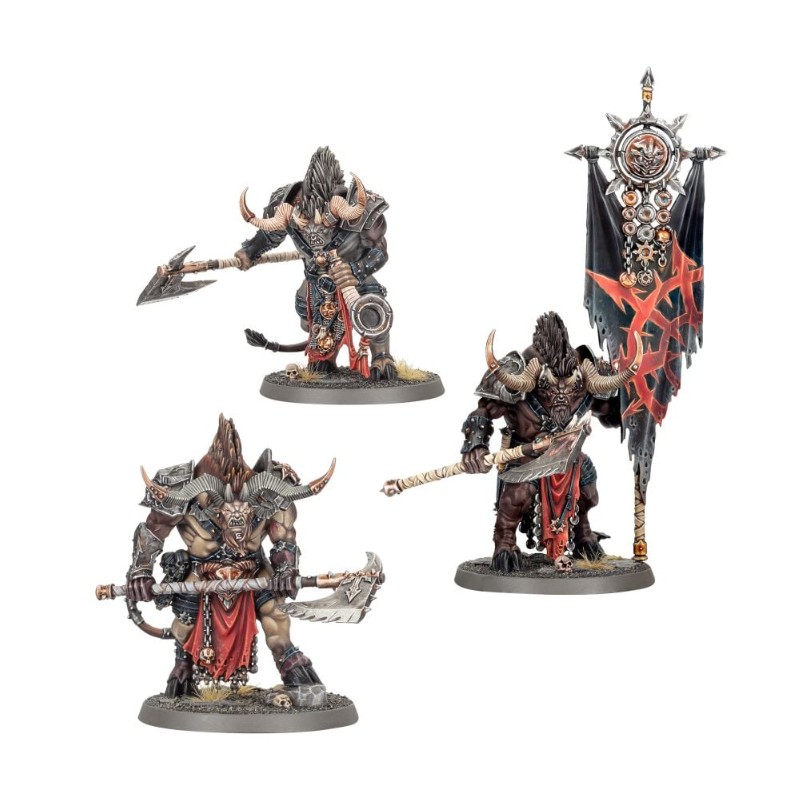 Ce kit plastique permet d'assembler trois Théridons Ogroïdes, de féroces guerriers qui dominent les soldats mortels. Chaque Théridon peut être équipé d'une arme brutale selon votre choix : une grande hache goroanne à deux mains ou un sabre goroan et un bouclier. Ce kit contient également les éléments nécessaires pour assembler l'une des figurines comme champion Thorakon avec un umbo unique, et les deux autres comme un fier Porte-étendard et un Sonneur de Charge tenant un cor.