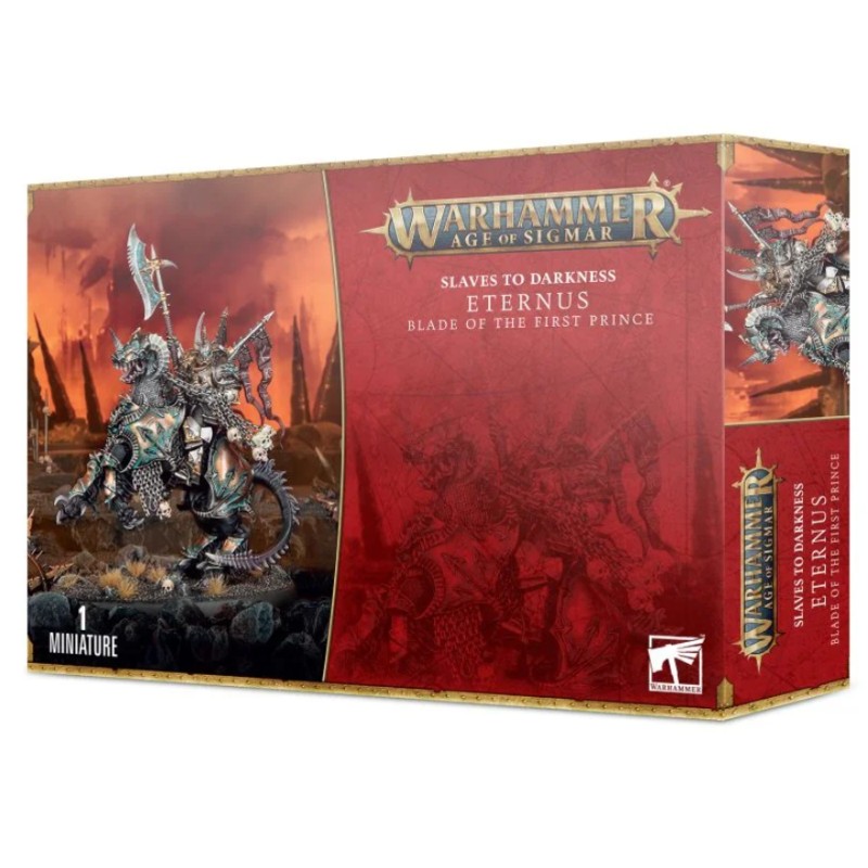 Ce kit plastique permet d'assembler Éternus, la Lame du Premier Prince, l'exécuteur immortel de Be'lakor. Cet imposant champion du Maître des Ténèbres est sur le dos de sa monture démoniaque en train de cabrer, le puissant Drakocephalus, et il manie à la fois un vouge mortel gravé de runes et un fléau des crânes. Son armure ornementée est parée de visages démoniaques grimaçants, comme il sied à un agent du Premier Prince, tandis que quatre fanions pendent dans son dos en parodie de gloire chevaleresque et flottent dans le vent vicié des Cieux Maudits.