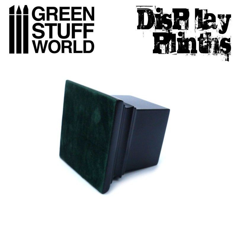 Socle Carré Ouvragé en bois MDF, idéal pour exhibier vos figures. Le bas de la base est recouverte d’un mince tapis de couleur vert foncé.