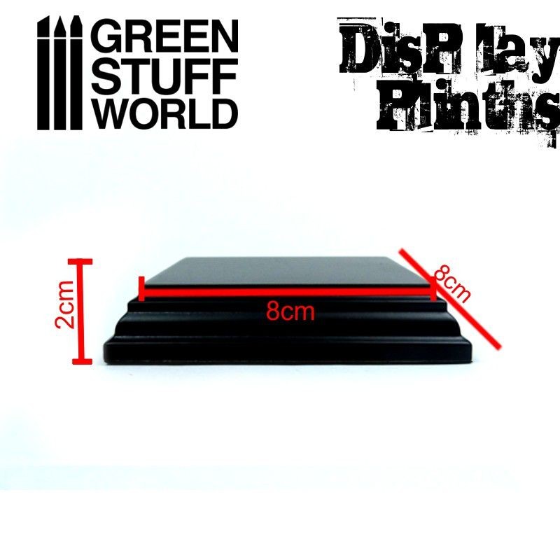 Socle Carré Ouvragé en bois MDF de couleur Noir Laqué, idéal pour exhibier vos figures. Le bas de la base est recouverte d’un mince tapis de couleur vert foncé.