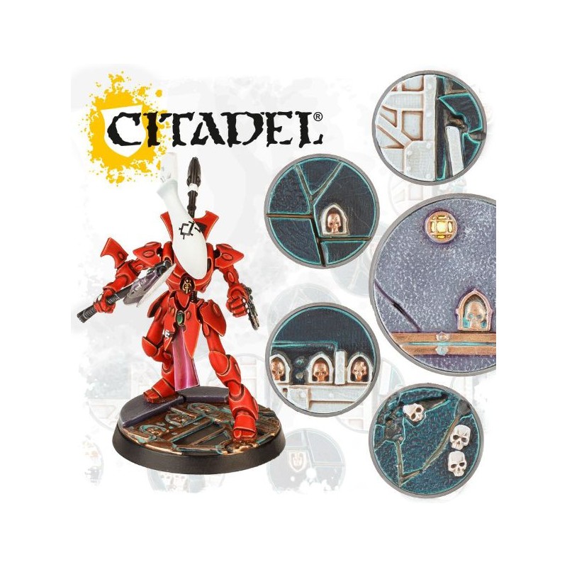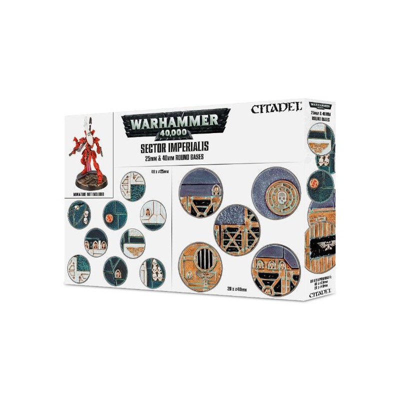 Vous recevrez 40 socles ronds texturés de 25mm et 20 socles ronds texturés de 40mm, plus 32 crânes décoratifs, qui vous aideront à assortir votre armée au Sector Imperialis!
