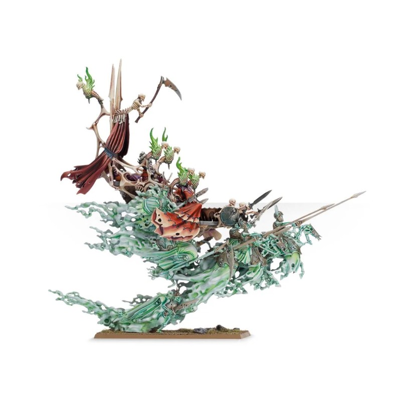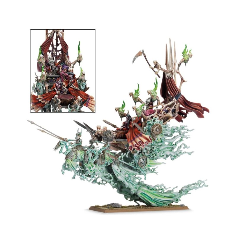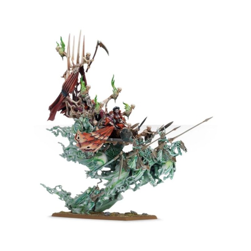 La Mortis Engine est une figurine imposante dont la moitié inférieure est éthérée au-delà de la raison. Des volutes de brume fantomatiques, agrémentées de ci, de là de pièces d’armure, s’élèvent, menée pat des cavaliers squelettiques sur destriers caparaçonnés. La moitié supérieure de la figurine accueille le sinistre Corpsemaster, entouré de banshees. Ce kit impressionnant comporte une foule de détails comme des lanternes, des squelettes, des coussins décadents et des flammes magiques.