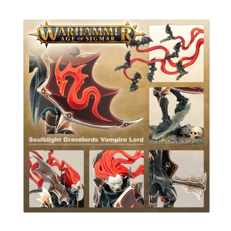 Chefs tout désignés pour une formation guerrière de Soulblight Gravelords, les Vampire Lords incarnent tout ce à quoi aspire un sujet affligé par la malédiction ruinemânes. Capables de balayer des unités entières de soldatesque ordinaire aussi aisément qu'ils tissent la magie macabre de Shyish, ces guerriers éprouvés ont pour plus grande force leur emprise sur les hordes traînantes qui les suivent. En déchaînant la rage bestiale que recèle leur soif de sang surnaturelle, ils poussent les squelettes et zombies de leur entourage à des sommets de violence inouïs.