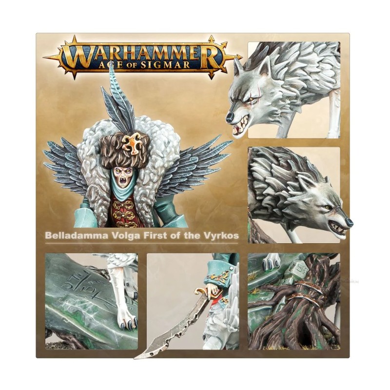 Description du produitOn ne sait que très peu de choses sur la Première des Vyrkos. Quand elle part en chasse avec ses meutes de loups, l'ennemi succombe sous un déluge de griffes féroces et de crocs avides, et ses champions sont affreusement métamorphosés par la cruelle et ancienne matriarche.