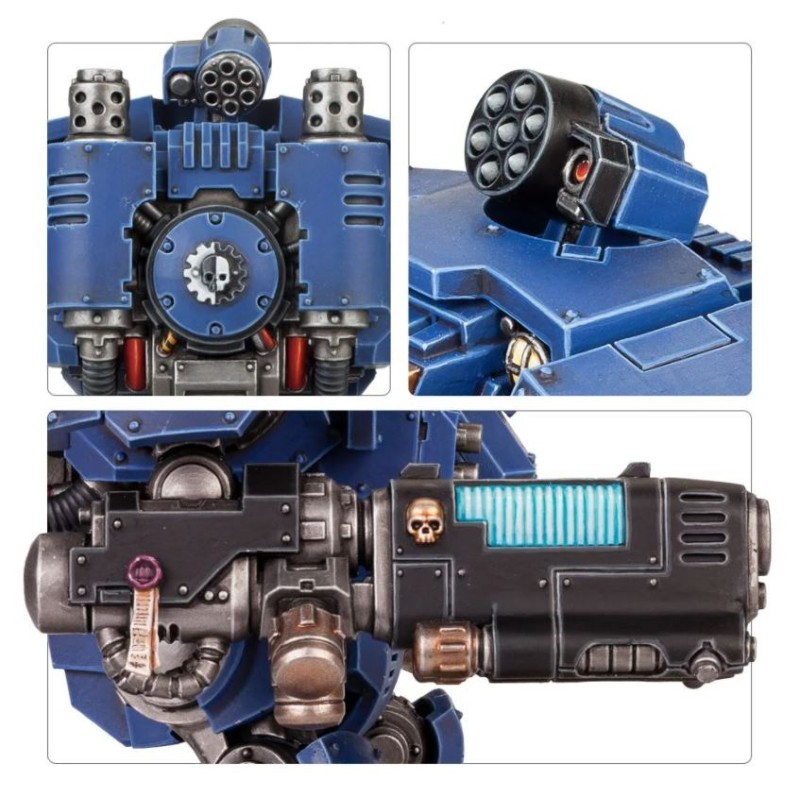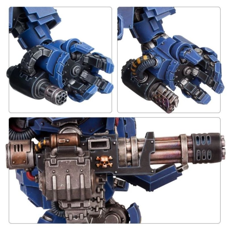 L'épais blindage frontal du Dreadnought Redemptor – tout en surfaces planes et angles nets, propices aux décalcomanies et éclaircissements – peut être représenté en position ouverte pour montrer le sarcophage interne. Les hobbyistes audacieux peuvent couper les tenons qui servent de guides pour monter la taille, les bras et les jambes, afin de se donner toute liberté dans le choix de la posture.