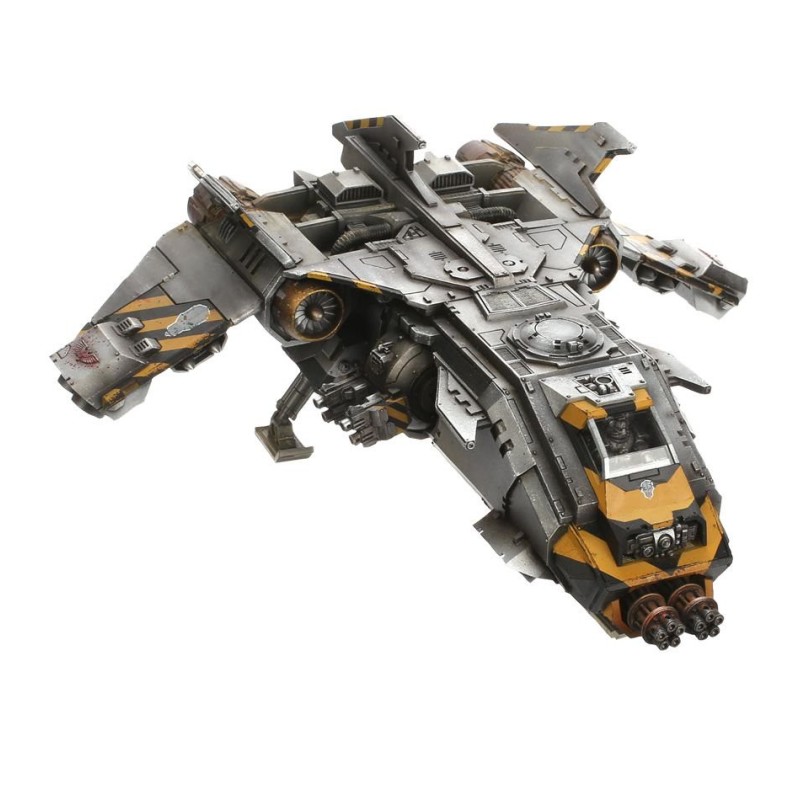 Le Fire Raptor Gunship est un kit complet en résine et en plastique armé d'un canon vengeur à deux tubes, de missiles Hellstrike montés sur les ailes et de deux tourelles à boule équipées de bolters lourds quadruples ou d'autocanons à deux tubes.