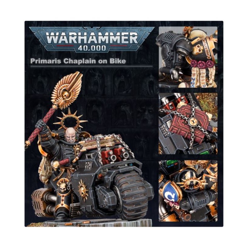 Ce kit permet d'assembler un Chapelain Primaris à Moto. Il est fourni en 33 composants plastique avec au choix une tête nue ou casquée, un socle ovale de 90mm, et une planche de décalcomanies pour Personnage Primaris.