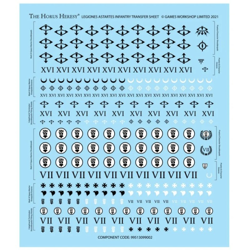 Ces figurines n'ont aucun marquage de Légion, ce qui permet aux hobbyistes Warhammer de les peindre de la couleur de leur choix. Cependant, la boîte contient une planche de décalcos de 293 marquages et icônes optionnels pour les Légions des Sons of Horus et des Imperial Fists.