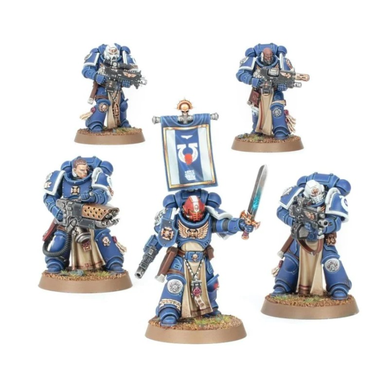 Ce kit contient 171 éléments en plastique, 5x Socles Ronds Citadel de 32mm et une Planche de Décalcos d'Infanterie Space Marine. Ces figurines sont fournies non peintes et nécessitent assemblage