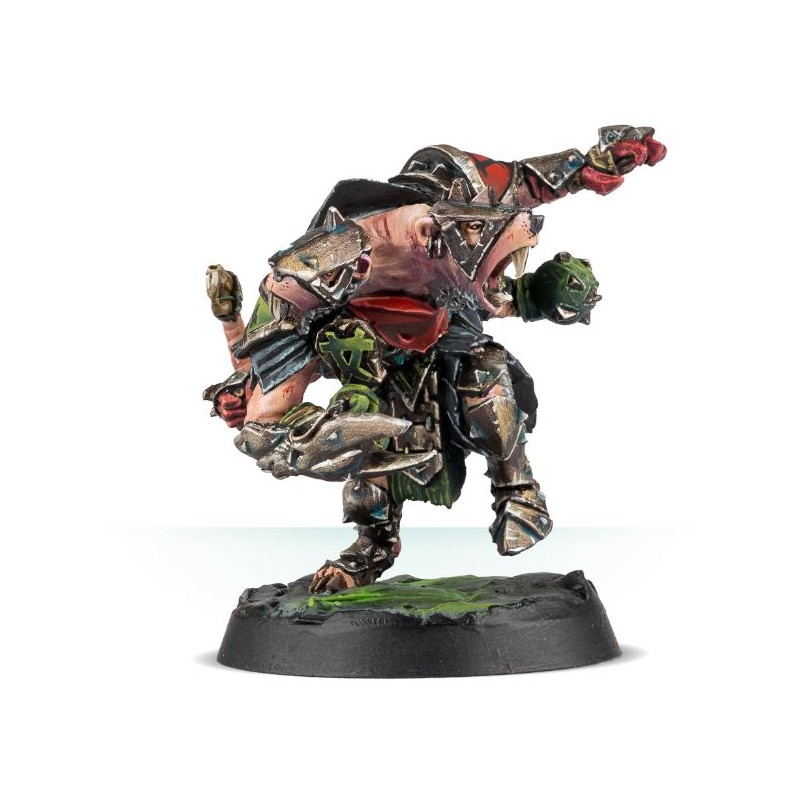 Maintenant, étant donné le temps passé à assurer la mort de tout Skaven qui semble pouvoir rivaliser avec lui, vous pourriez penser que Hakflem Skuttlespike néglige ses devoirs sur le terrain sacré de Blood Bowl. Mais ce n'est pas le cas ! Grâce à cet étrange kit en résine à deux têtes, vous pouvez l'aligner en tant que joueur vedette dans n'importe quelle équipe "Favoured of..." ou Underworld Challenge de votre choix. Furieux, musclé et orné de pointes, il est posé de manière agressive, ses deux gueules aux dents acérées hurlant des menaces incompréhensibles à l'encontre de n'importe quel adversaire qui se trouve sur son chemin. Chacune de ses quatre mains (comptez-les !) est prête à tuer, avec des gants en métal et une boule à pointes parmi le désordre. Il y a même de la place pour quelques symboles skavens sur son armure.