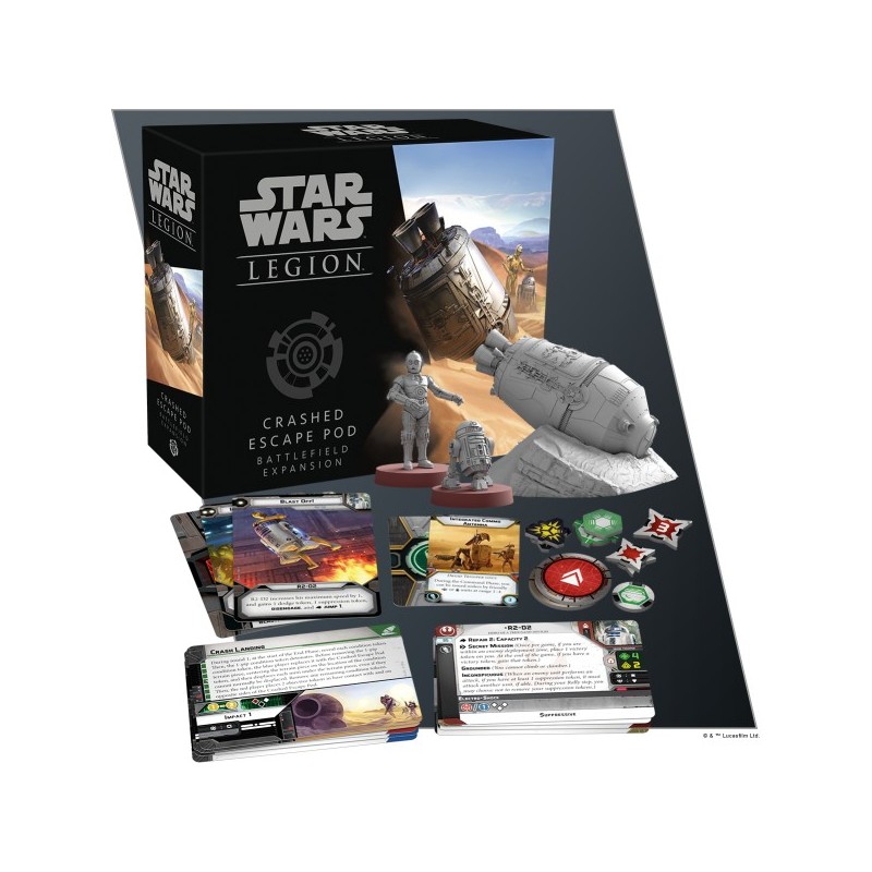 Cette extension contient une figurine de capsule de sauvetage écrasée finement sculptée, une figurine de C-3PO et une figurine de R2-D2, ainsi que de nouvelles cartes de combat, d'unité, d'amélioration et de commandement. La figurine de la capsule de sauvetage écrasée peut être utilisée comme pièce de terrain pour améliorer votre champ de bataille ou être combattue dans le cadre d'un scénario unique à l'aide des cartes de combat. Quant aux figurines C-3PO et R2-D2, elles peuvent être utilisées comme objectifs de scénario ou comme unités de l'Alliance rebelle ou de la République galactique.