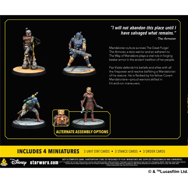 Description du produitLe pack d'escouade This Is The Way (Mandalorian Covert) amène les personnages préférés des fans, l'Armurier, Paz Vizsla, et les Mandaloriens cachés sur les tables de jeu !