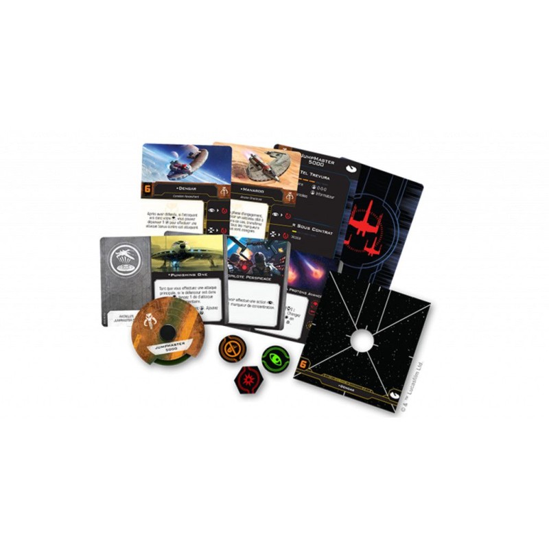 Dans le pack d'extension Punishing One, vous trouverez tout ce dont vous avez besoin pour ajouter un JumpMaster 5000 à vos escadrons Scum & Villainy. Les réimpressions de trois pilotes rejoignent Dengar dans la recherche du profit tandis que douze cartes de mise à niveau réimprimées offrent aux nouveaux joueurs de nombreuses options pour donner une touche personnelle à leurs vaisseaux. Enfin, deux cartes Quick Build offrent des combinaisons judicieuses de pilotes et de mises à niveau pour optimiser l'efficacité de votre JumpMaster 5000.