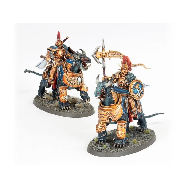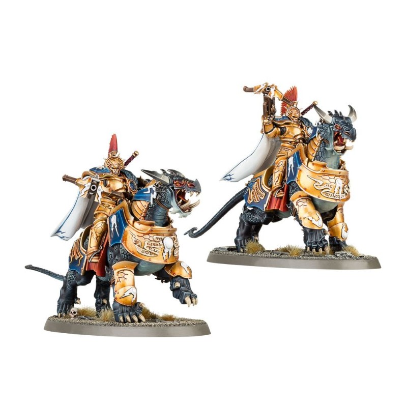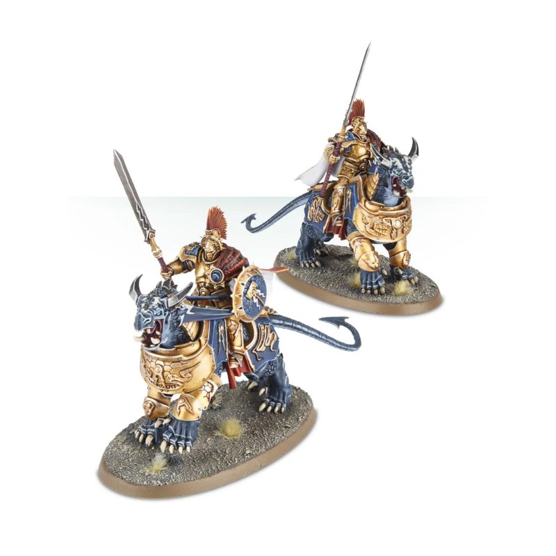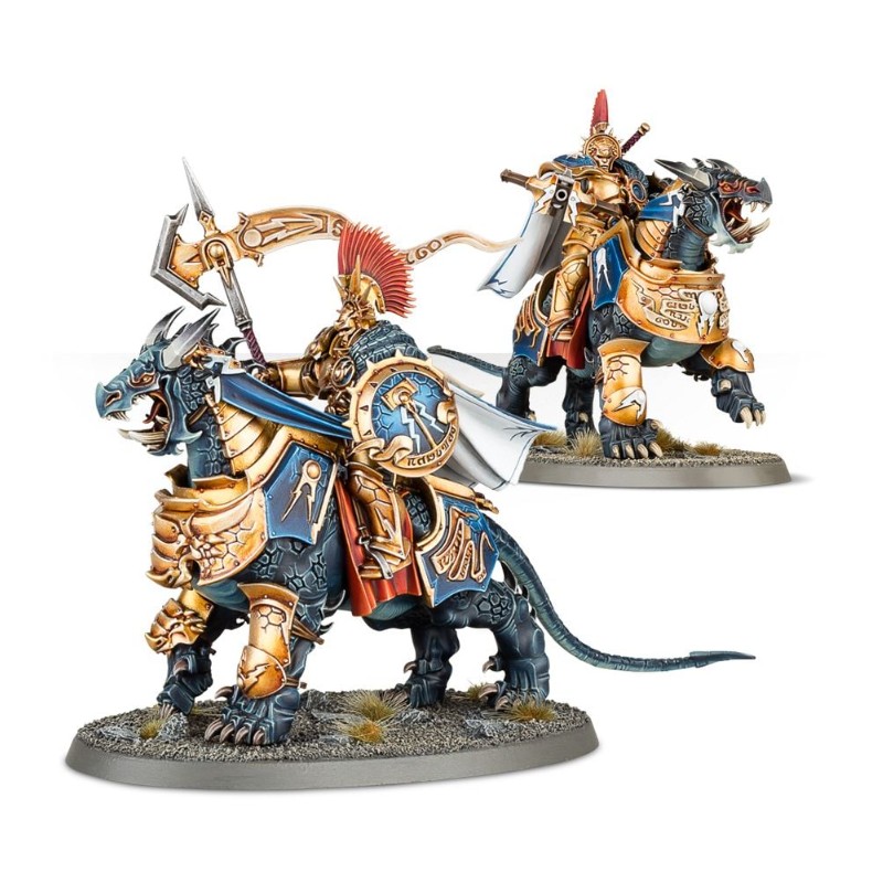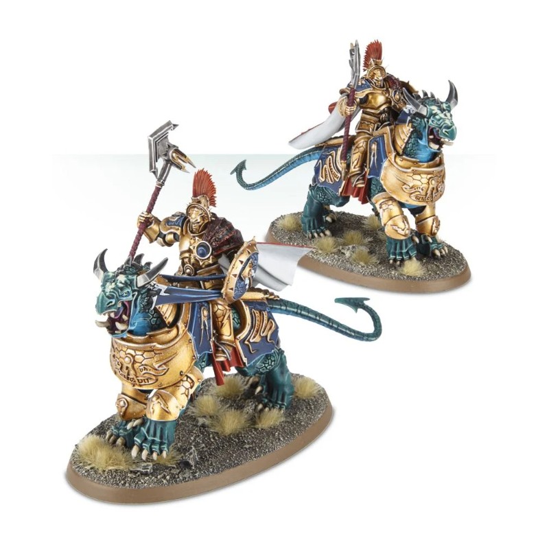 Ce kit plastique comprend tout le nécessaire pour assembler deux Dracothian Guard Fulminators armés de glaives Stormstrike et de boucliers de sigmarite, et montés à dos de féroce Dracoth.