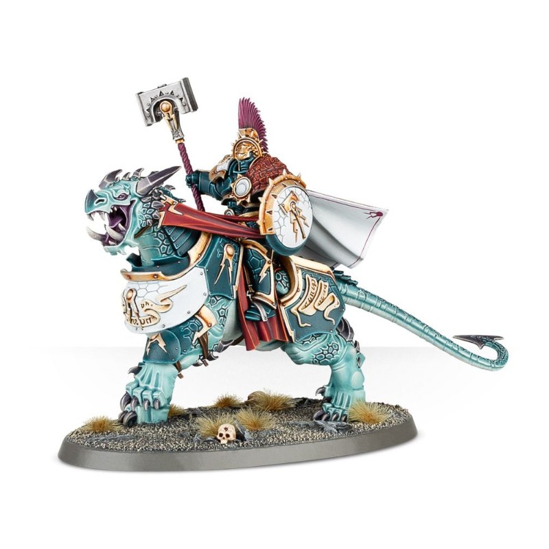 Il n'existe aucun adversaire que les agressifs et audacieux Fulminators n'osent charger. Un pic d'énergie céleste s'accumule sous l'élan de leur assaut, et le sol tremble comme un nuage crépitant qui s'étend telle l'onde de la guerre devant leurs glaives Stormstrike. En tant que fer de lance de la Dracothian Guard, ils ouvrent la route à tous ceux qui les suivent.