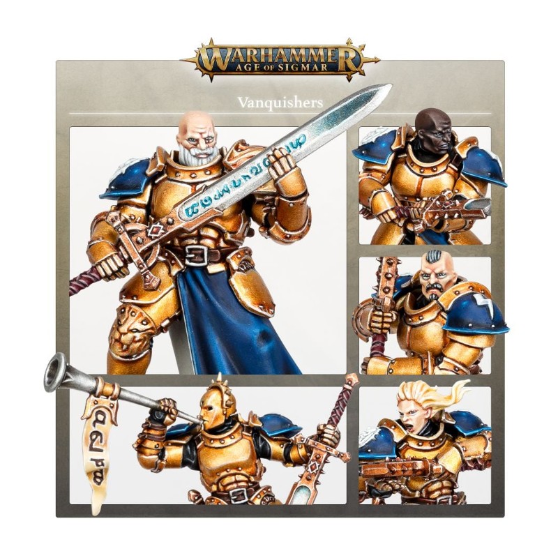 Le kit inclut aussi des options pour assembler un Vincitor-Primux, un Héraut Vincitor portant un cor de guerre, et un Porte-icône Tempétueux. Ce kit est fourni avec 10x socles ronds Citadel de 40mm. Ces figurines sont fournies non peintes et nécessitent assemblage.