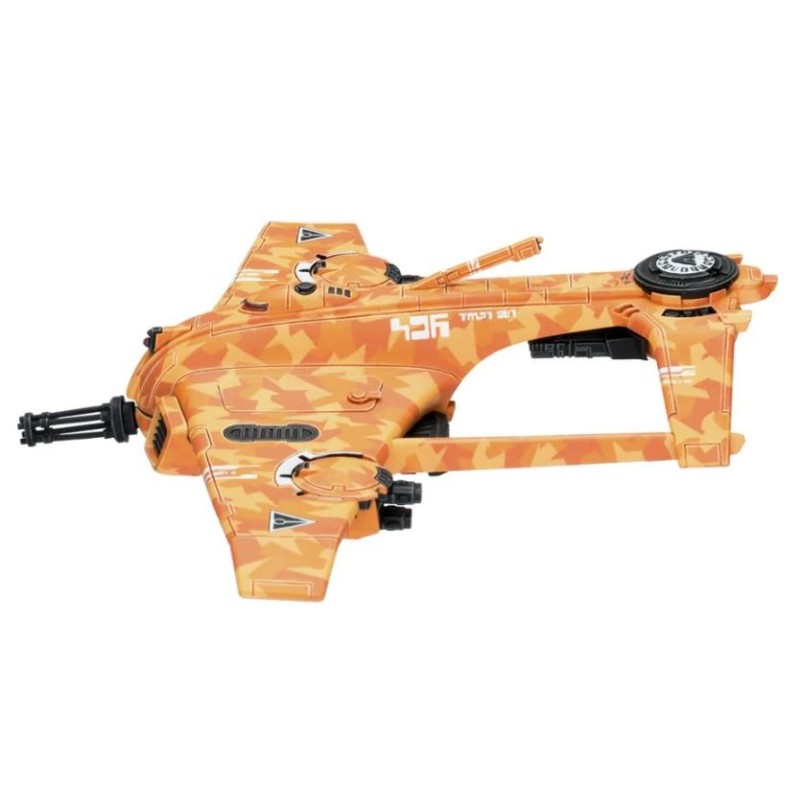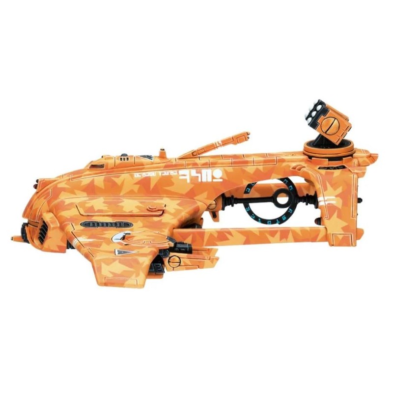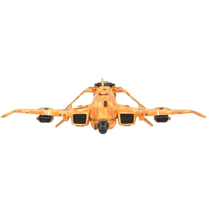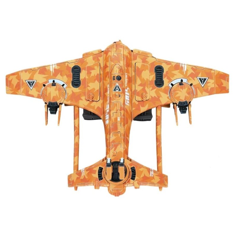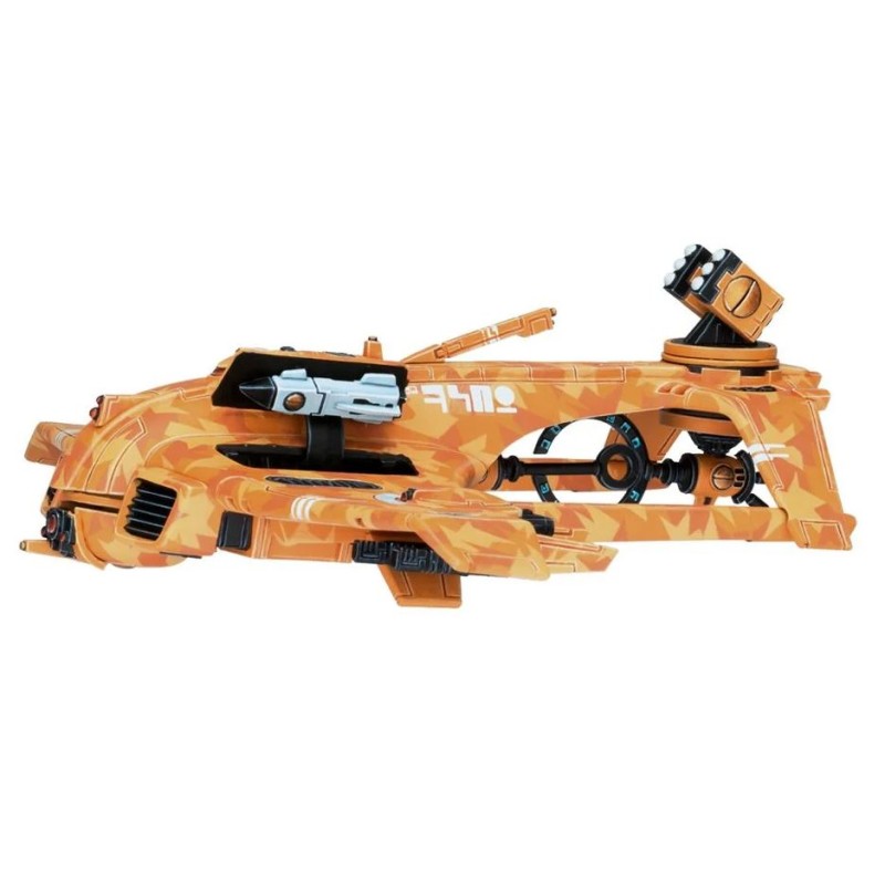 Description du produitLe kit de chasseur Razorshark illustre élégamment le design épuré des Tau. Le bout de ses ailes est orienté vers le bas, tout comme ses stabilisateurs, eux-mêmes reliés à l'avant par des montants qui encadrent une tourelle quadritube à ions. Les détails vont de l'insigne de la caste de l'Air sculpté sur le haut de la figurine à différents panneaux et évents, en passant par les optiques, l'antenne et le système bimoteur positionné de part et d'autre du nez de l'appareil. Les options d'armes secondaires comprennent des fusils à ions jumelés, un canon à induction, une nacelle de missiles, un désignateur laser multinode, des missiles à guidage, ainsi que 2 drones intercepteurs intégrés aux ailes et pouvant s'en détacher.