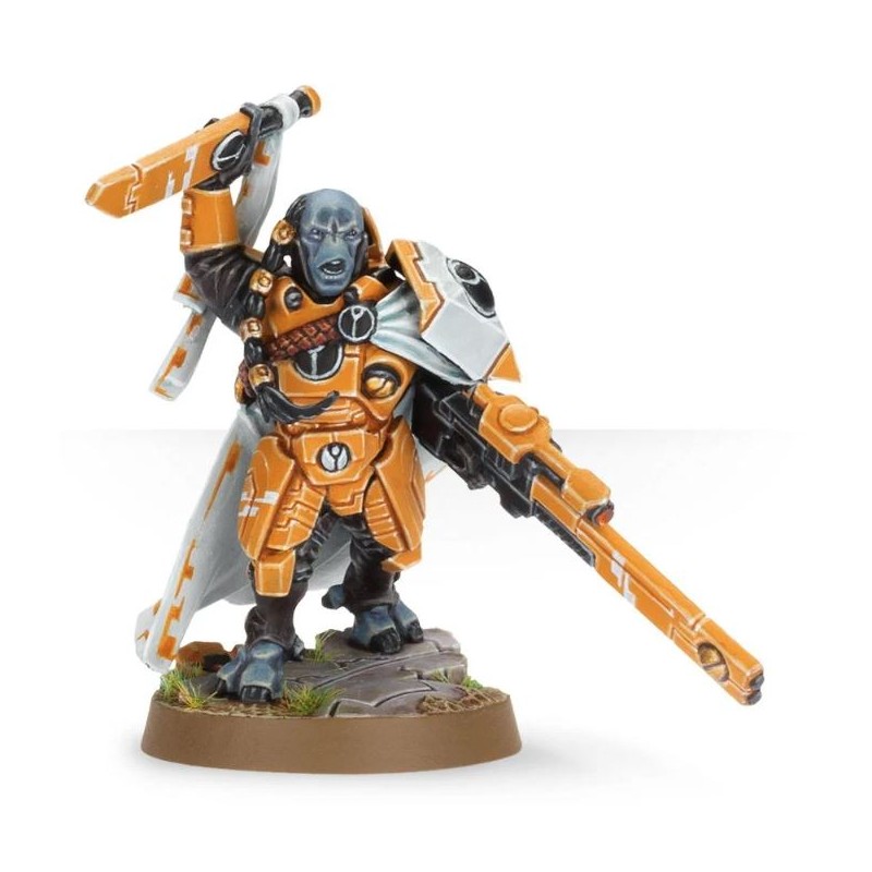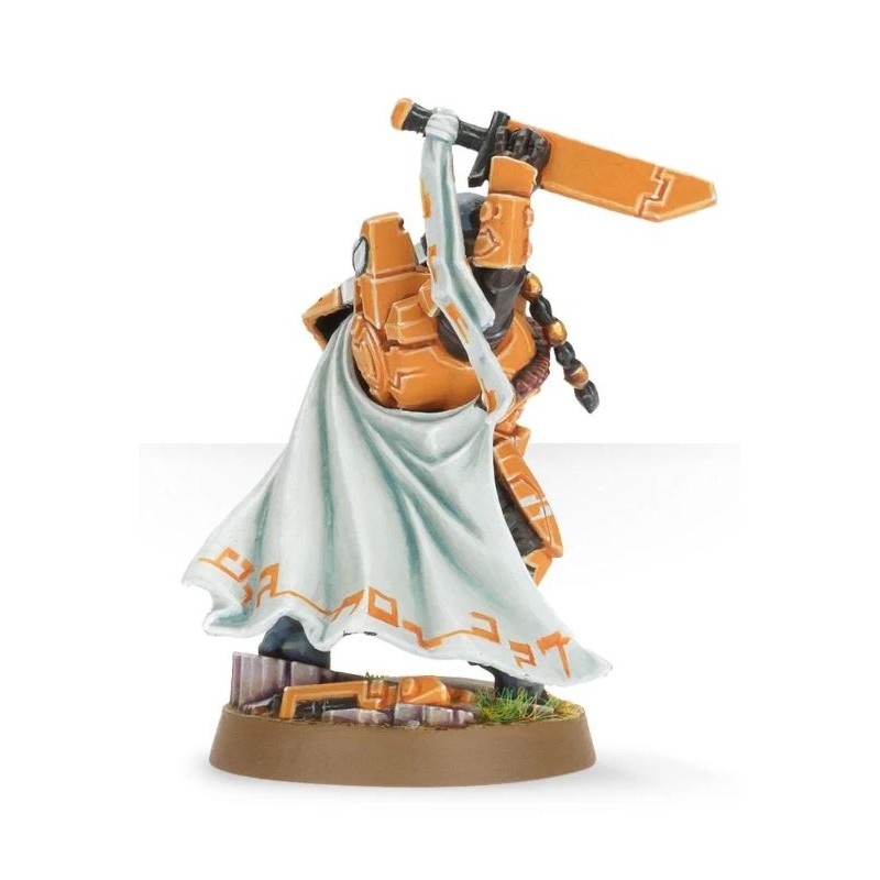 La figurine de Cadre Fireblade ajoute du dynamisme et du détail à une collection de T'au. Le sujet est très élaboré, avec une armure aux plaques uniques ornées de symboles T'au. Il arbore une expression triomphale, il tient d'une main un grand couteau rituel, et de l'autre un fusil à impulsions avec désignateur laser. Il se tient sur un socle sculpté représentant une portion de ruine, il porte une ample cape et sa longue chevelure est retenue par une série de fermoirs.