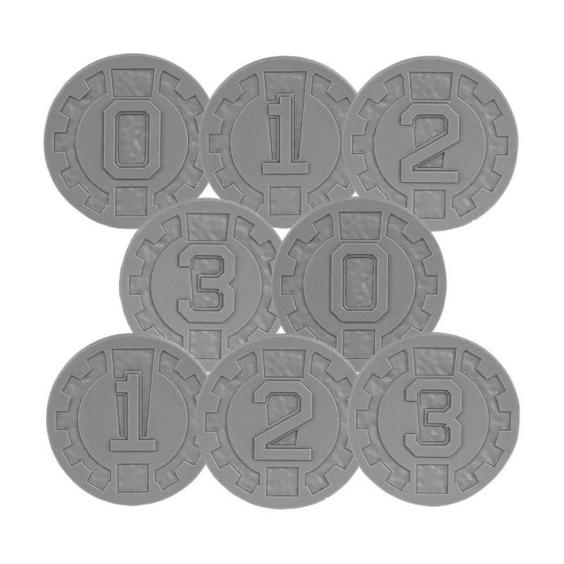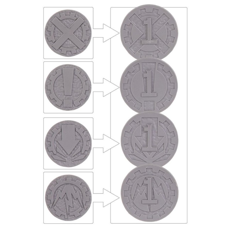 Ce set de pions en plastique double face vous permet de garder facilement un œil sur les Objectifs et les Statuts Tactiques de vos unités durant les parties de Warhammer: The Horus Heresy. Vous trouverez des pions pour les statuts Fixé, Neutralisé, Sonné et En Déroute, avec une icône sur une face, et le chiffre du modificateur correspondant au verso. Ces chiffres vont de 0 à 3, et il y a deux exemplaires de chaque dans le set. Les pions sont moulés en relief, ce qui vous permet de les utiliser peints ou non peints. Vous trouverez également huit Marqueurs d'Objectif – 3x marqueurs "1", 3x marqueurs "2" et 2x marqueurs "3". Vous pourrez ainsi garder votre esprit concentré sur la partie pendant que ces pions vous rappellent le statut de vos unités clés.