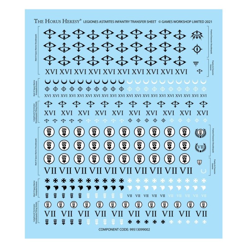 Ces figurines ne possèdent pas de marquages de Légion, ce qui permet aux hobbyistes Warhammer de les peindre dans les couleurs de leur choix. Cependant, la boîte inclut une planche de décalcos avec 293 marquages optionnels et emblèmes des Légions des Sons of Horus et des Imperial Fists.