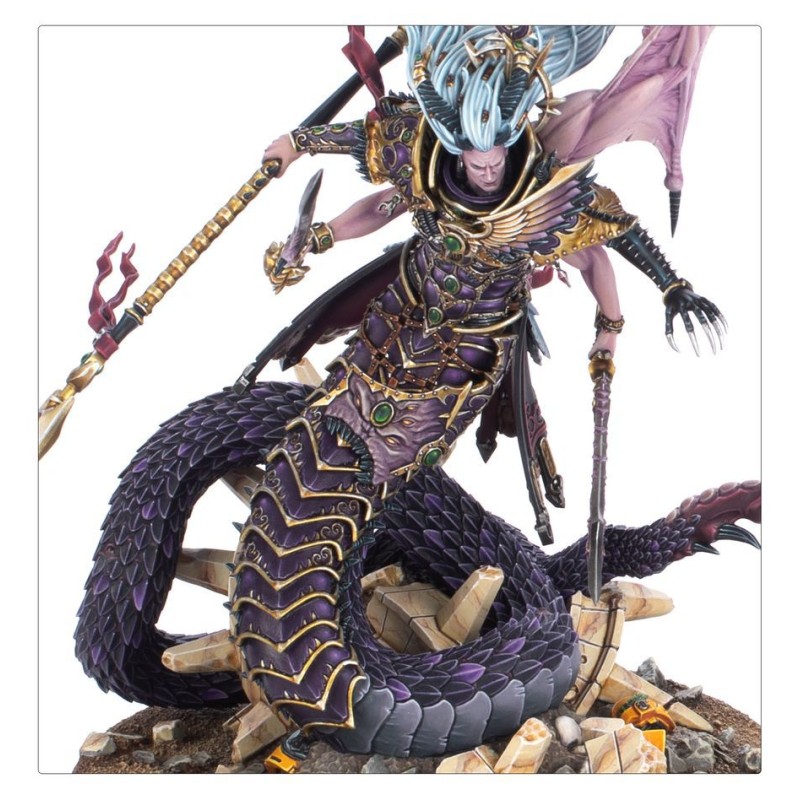 La queue ophidienne de Fulgrim est lovée autour de ruines broyées, et on entrevoit une épaulière aux armes de la Légion des Imperial Fists enfouie dans les gravats que domine le grandiose et sinueux Primarque Démon.